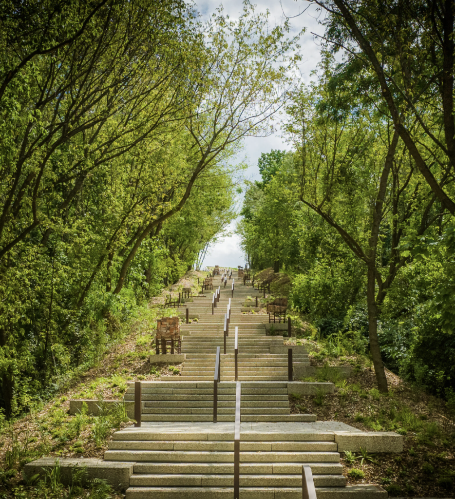 Architektura krajobrazu została tu oparta na istniejącej topografii, naturalnych różnicach wysokości i materiałach obecnych na miejscu. Ścieżki, platformy widokowe i elementy małej architektury prowadzą użytkownika przez krajobraz w sposób intuicyjny, pozwalając doświadczać przestrzeni zarówno jako parku rekreacyjnego, jak i miejsca refleksji.